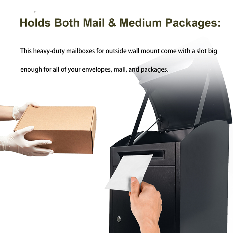 Weatherproof: The parcel box is made of sturdy galvanized steel with a powder coating finish, which make parcel box corrosion-proof, and the anti-water struction against rain and wind.