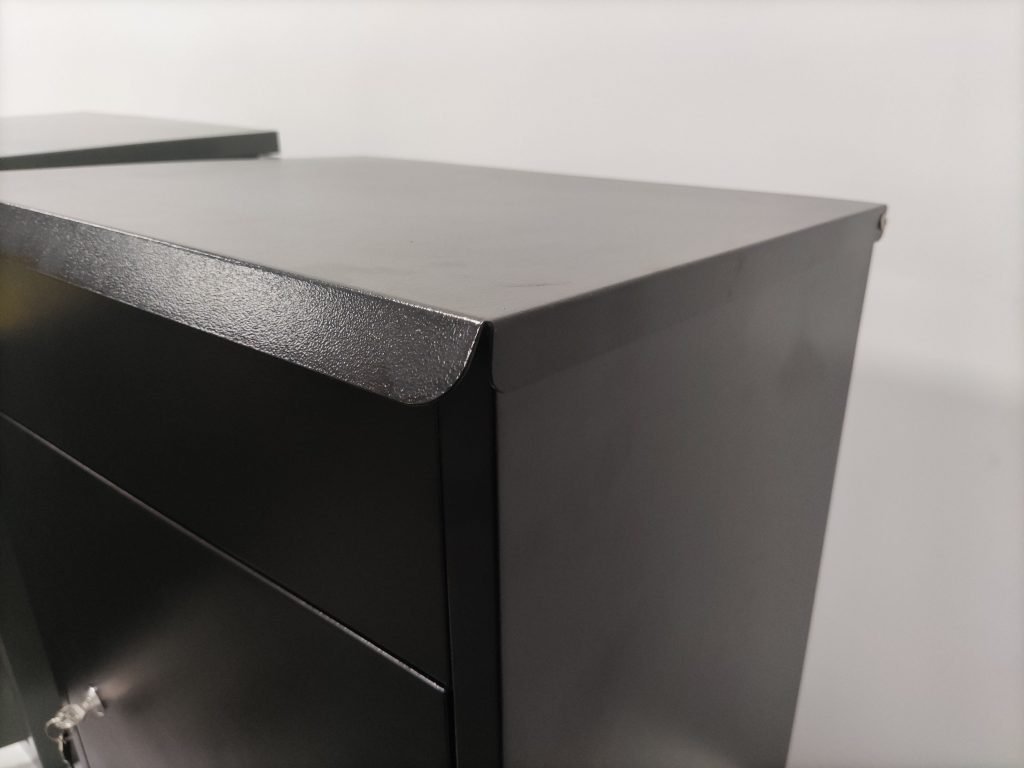 But the new one modify the structure of the top cover,not only extending the top cap to completely cover the surrounding cabinet,but also changing the top cover from the previous horizontal design to tilt from the front to the back, so that the dripping rainwater will flow down from the back of the cabinet.And we also changed the connection way between parcel box top cap with cabinet,we began to use the riveting process,it’s easier and more convenient,also reduce the parcel box wasted space.